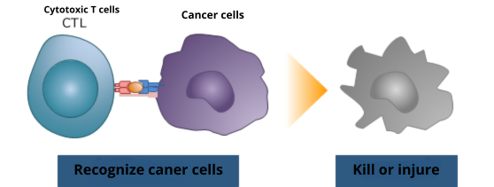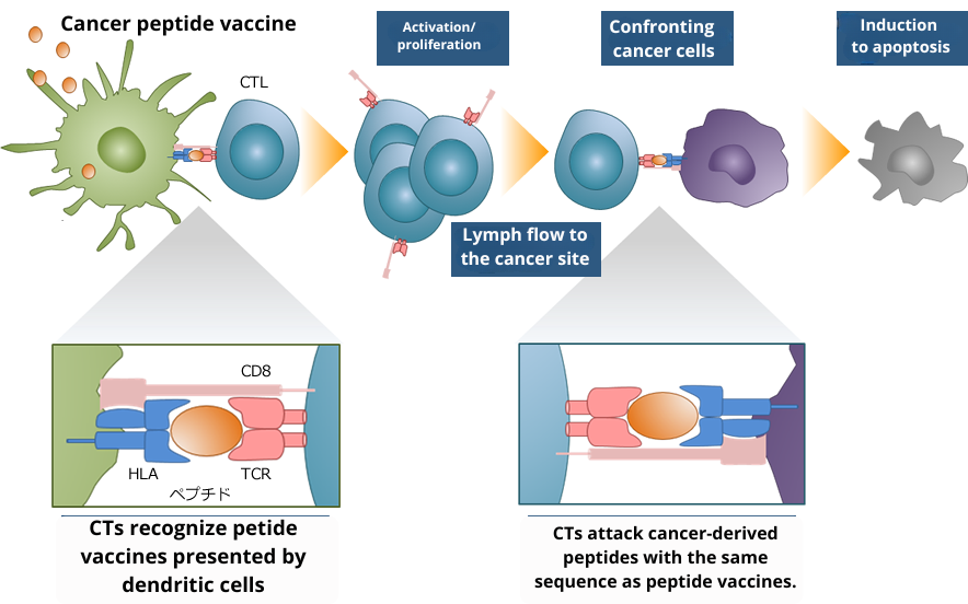The cancer peptide vaccine we are developing functions by delivering cancer antigen peptides that stimulate cytotoxic T lymphocytes (CTLs), a crucial component of the immune system. Once activated, CTLs recognize cancer-specific antigens displayed on the surface of tumor cells and subsequently eliminate those cancer cells.
